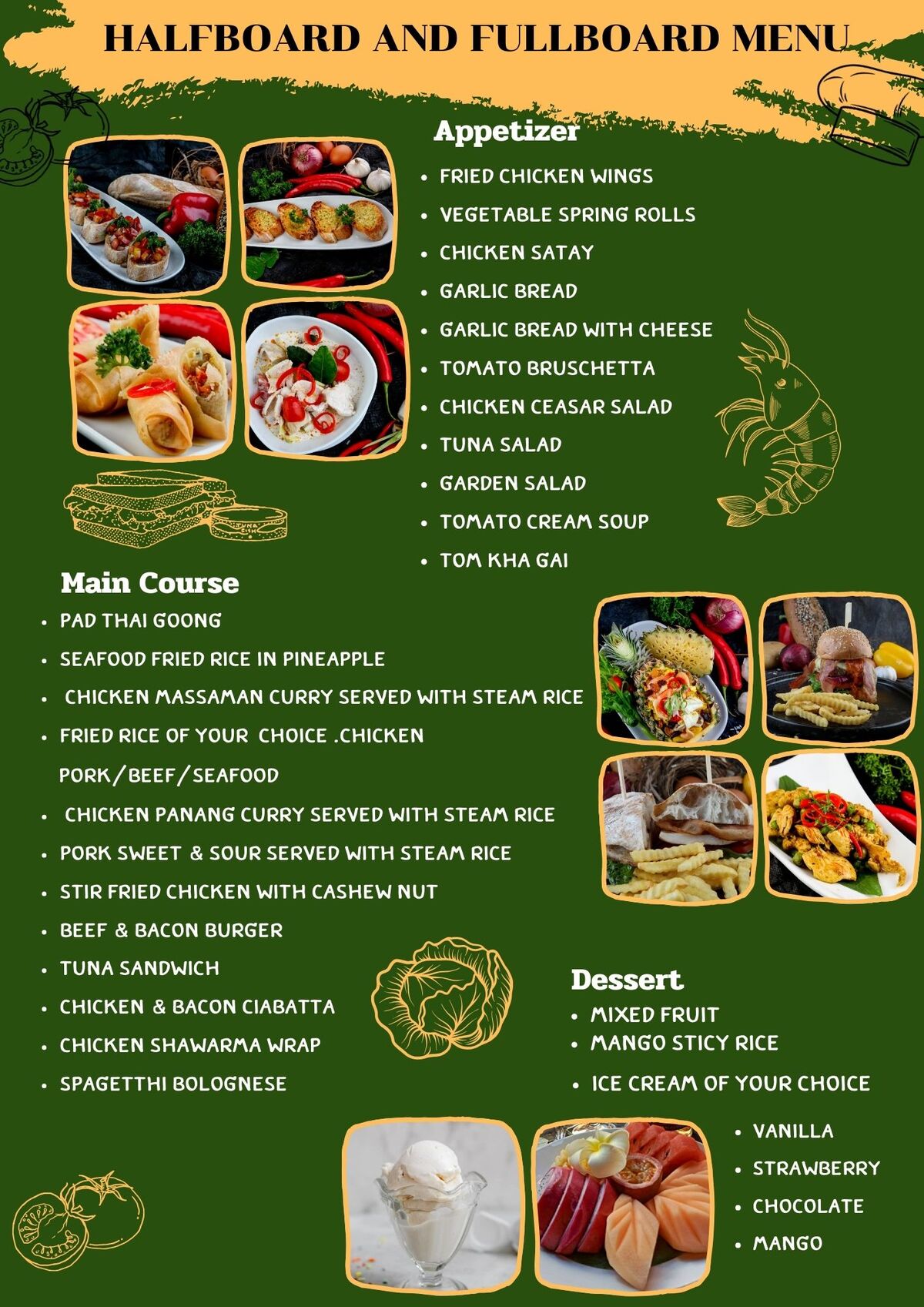 • 每日晚餐(从我们的半膳菜单中选择,每日菜品不同)